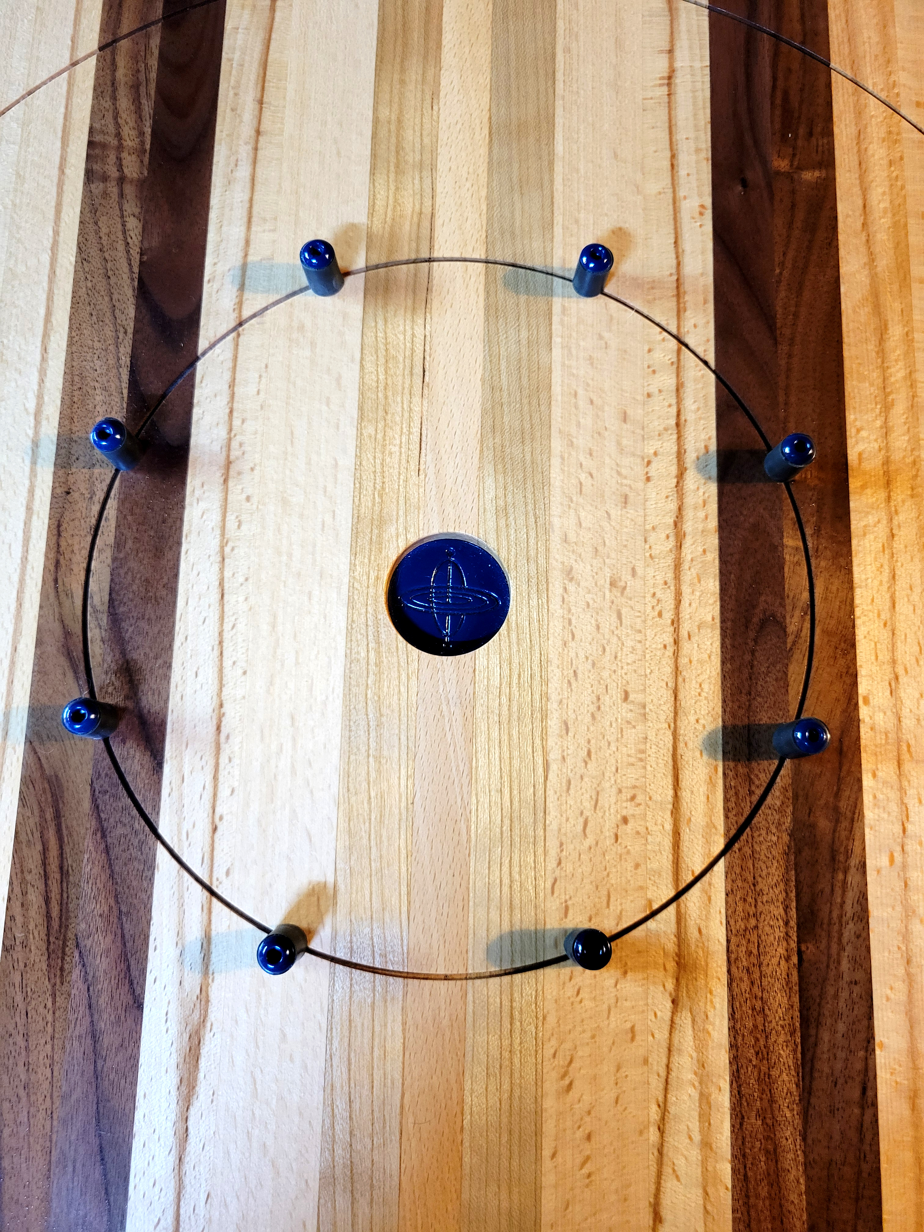 - But the deck isn’t the only part of a Gyroscope Games crokinole board that is made with solid hardwood. Our rails are solid hardwood as well, and are often with interesting species of hardwood, or mixes of species of wood. There's no plywood or manufactured materials involved. Just solid laminated hardwood. We don't make octagonal games. Our contemporary rails are round and they're 3/8” thick. They feel great under your hand when you are preparing to shoot, and when you’re not shooting, they’re great to look at. How do we do it? With steam? A magic wood-bending force field? It’s a classified, proprietary method and it’s going to stay that way.